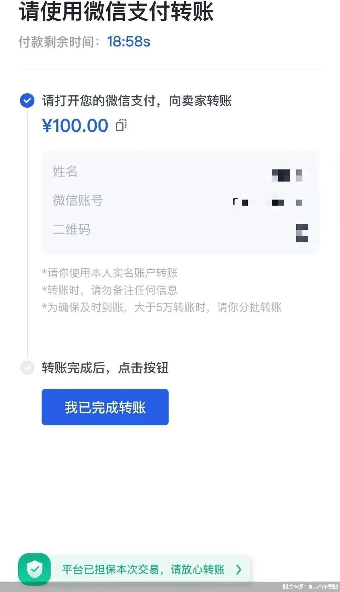 该人士还强调,转账时请勿填写USDT、BTC等字样备注,避免转账拦截;若转账遇到风险提示,则需要把交易的金额转入用户微信零钱通,在转账时选择零钱通付款,若金额低于200元,买家可以直接微信红包,这样就不会被拦截。