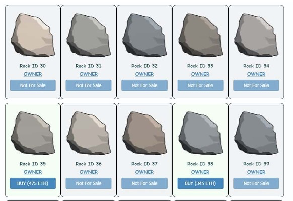 几周前,“ETHRock #21”以 45 个以太坊(现价约14.8万美元)的价格售出,而这几天它们的价格更是直冲月球,最近成交的一些石头价格分别为64万、71万、83万美元不等,现在平台上最便宜的一颗石头都要卖到95个以太币(约31万美元)。