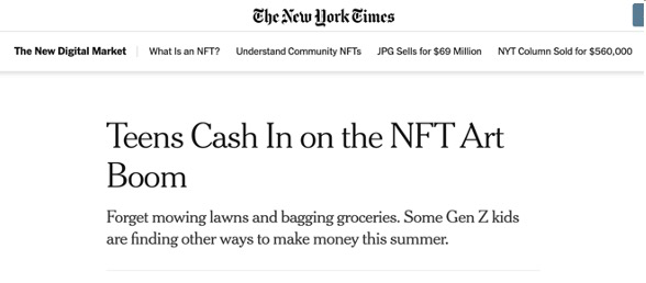 纽约时报在上周发布了一篇名为《年轻人们正在从NFT热潮中赚钱》文章,表示很多青少年们开始投入NFT作品创作并赚到了人生的第一桶金。比如来自英国伦敦的12岁男孩本雅明·艾哈迈德,今年7月上线了自己的NFT作品《怪异鲸鱼》,整个系列在9小时内售完。他在一天内赚了80枚以太币,收入超过35万美元。