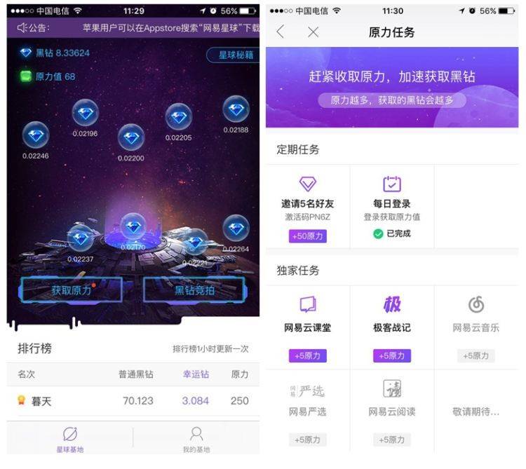 游戏中每日会生产黑钻供玩家领取,玩家像收菜一样的运动小指领取就拿到了,玩家还可以做任务提升原力,原力越多获得的黑钻也就越多,但是黑钻总产量有限,且每2年产出率降低一半,伴随着時间的变化获得难度系数也将越来越大。依据“网易星球”的游戏玩法,黑钻领取只能免费领,不用在线充值,也不兼容交易买卖。