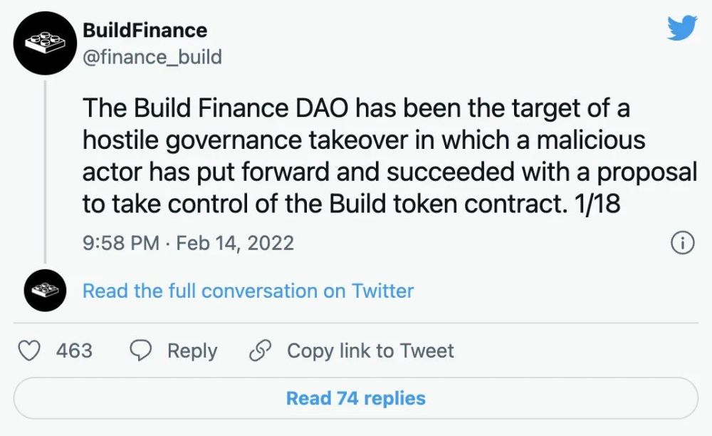 2月中旬,Build Finance遭遇了一场治理接管,该攻击者成功通过了投票,将治理合约、铸造密钥和金库的完全控制权移交给了他人。在经历了一次失败的尝试后,攻击者将BUILD代币发送到另一个钱包,并再次提交接管提案。通过禁用gitbook和提案机器人,并因其拥有足够的代币达到最低批准,攻击者成功通过了该提案,创建了110万BUILD,并耗尽了Uniswap和Balancer上的LP池,获利50万美元。