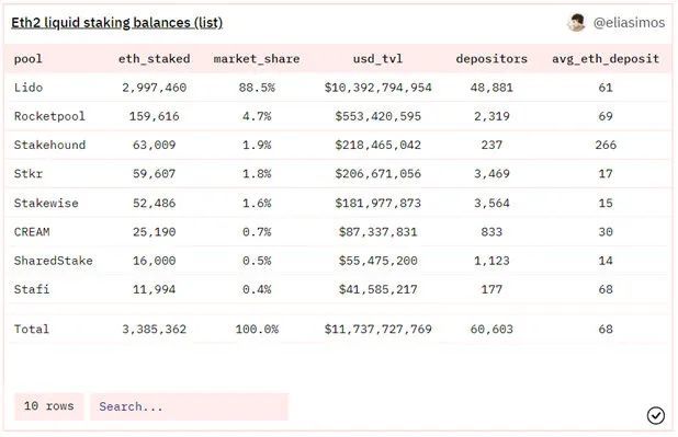 娱乐一下,我们将看一个假设的Lido DAO被接管的例子,以及随后对其流动性质押池的吸血鬼攻击。Lido是一个在以太坊上的流动性质押协议。Lido质押了近30亿的ETH,占网络中所有流动性质押余额的80%以上,占验证者和池中所有ETH质押总额的27%以上。Lido流动性质押池中的ETH存款可以获得stETH奖励,stETH可以存入Curve上的LP池,也可以在Aave、Maker、Compound和Alpha等借贷协议中用作抵押品。流动性质押为ETH持有人提供了急需的流动性,并允许持有人在Lido池奖励的基础上获得额外的奖励。即使是那些能够运行自己的验证者节点的大型质押者,考虑到经济风险,也没有什么动机去这么做,除了利他主义的原因(例如为网络提供安全)。