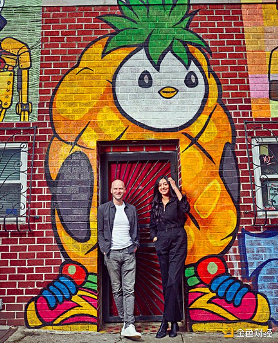 Tribute Labs 的 CEO Aaron Wright 和 COO Priyanka Desai 在布鲁克林的威廉斯堡,背景彩绘是一个流行的 NFT。