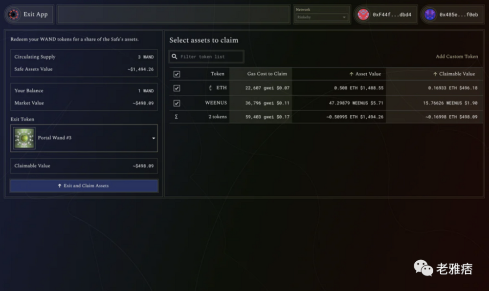 在自己的保险箱中持有DAO指定代币的成员现在也可以轻松退出。为了赎回,会员只需打开退出应用作为安全应用,输入DAO的安全地址,然后选择他们想要的代币。