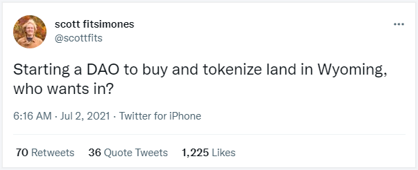 在这项立法之后建立的首批实体之一诞生于 Scott Fitsimones 于 2021 年 6 月在 Twitter 上发布的一条关于创建一个 DAO 以在怀俄明州购买一块土地并将该土地进行代币化的想法 (见下图)。来自德国、美国、爱尔兰和加拿大等国的一小群创始公民于 2021 年 7 月一起创建了CityDAO,目标是“在以太坊区块链上建设未来城市”。为此,这个群体通过将土地、权利和治理进行代币化,以此来实现资产所有权的去中心化。自 CityDAO 成立以来,已有近 6000 名投资者加入,贡献了近 700 万美元。