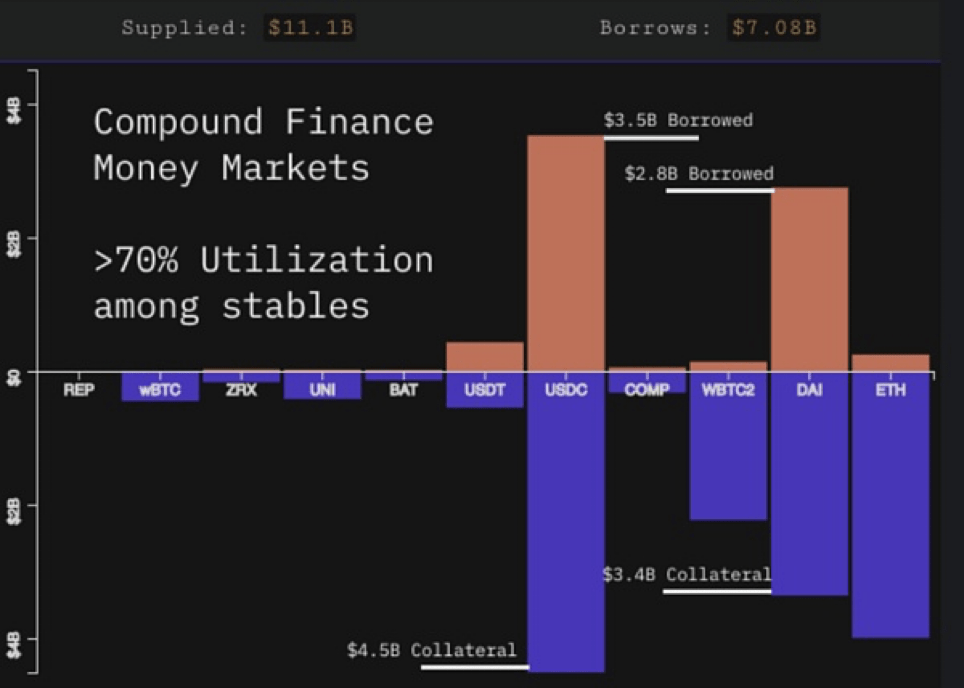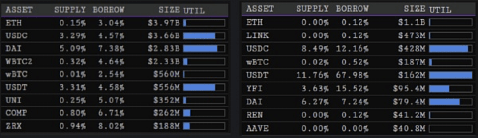 在每个协议中,都有单独的货币,其利率和利用率各不相同。以复利和Aave为例。利用率=1-(自由流动资金/市场规模)。如果有10亿美元的存款和1亿美元的借款,那么利用率将是10%。