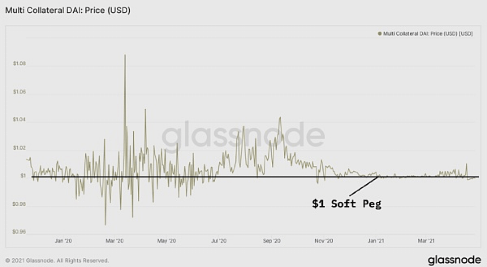 DAI在历史上一直保持着与美元挂钩的相对稳定。虽然发行量由MakerDAO管理,但交易者往往会试图从套利机会中获利,在1美元以上做空DAI,在1美元以下做多DAI。这种交易可以另外通过存入ETH来铸造DAI,或者反过来偿还CDP来提取抵押品。