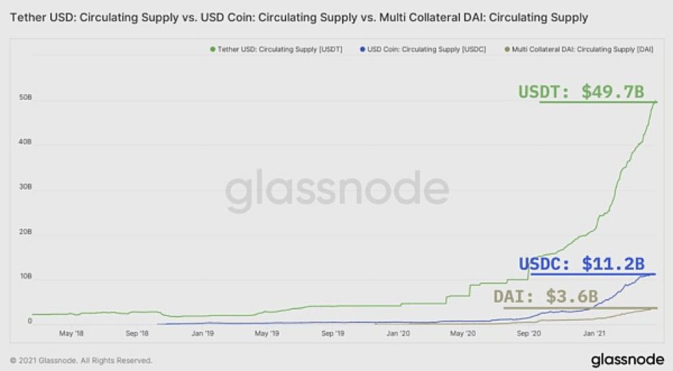 由于稳定币在借贷市场上提供充足的流动性和强大的利用率,稳定币已经成为大多数和借贷市场的基础货币。目前中央发行的、有储备金支持的代币USDT和USDC在市场份额中占主导地位,即便如此,DAI作为稳定币的增长仍然令人印象深刻,自成立以来,其流通供应量已达到36亿美元以上。