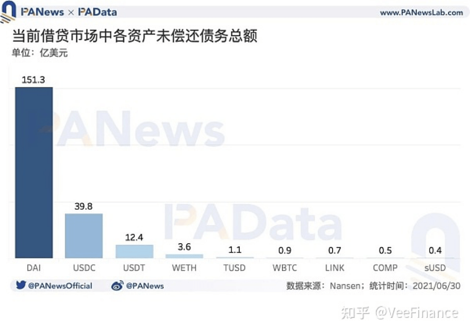 截至6月30日,DAI、USDC和USDT等稳定币是主要的借贷资产,其中,DAI当前的未偿还债务规模约为151.3亿美元,另两大稳定币当前的未偿还债务规模分别为39.8亿美元和12.4亿美元。其他资产的未偿还债务都未超过4亿美元。