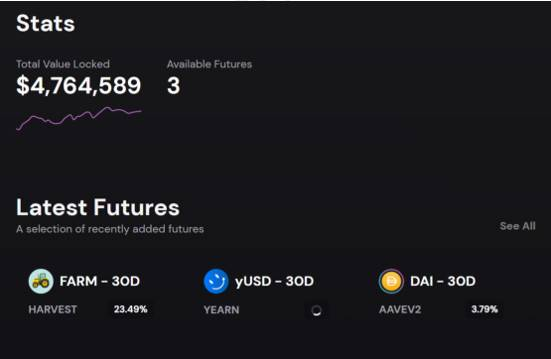 近期部署在 Rinkeby 测试网,开放了「DAI-355 Days」和「USDC-19 Days」两种产品,可分别用 DAI 与 USDC 来交易: