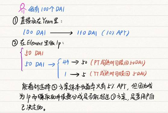 我们会发现 OT 代币与 YT 代币均可以质押在 AMM 池中提供流动性,所以这里就会有一个用户自己的选择,以 Element 为例:是选择直接放在 Yearn 机枪池里赚收益还是在 Element 里做 lp,哪个的收益更高是不确定的。下面我用一个图来展示: