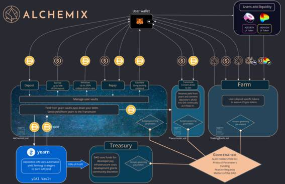谈到收益代币化协议我们必须介绍一下 Alchemix 这个项目。这是一款建立于 YFI 之上 DeFi 借贷产品,与一般借贷不同的是,Alchemix 号称 「让时间帮你还清债务」 ,即用利息来偿还贷款。一旦将 DAI 存进合约里,合约就会定期将赚到的钱用来替你偿还债务,直到还清用户的所有债务为止,又因为采用的是稳定币抵押,所以不存在清算风险。