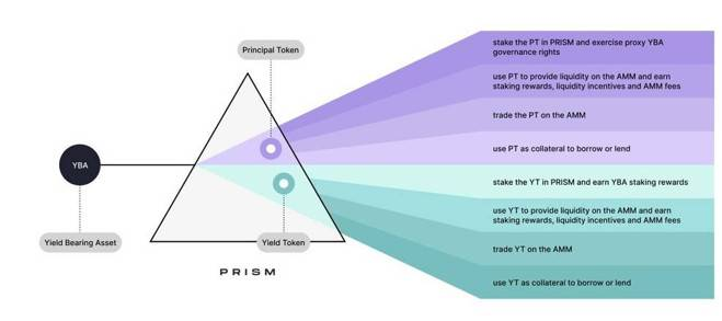 Terra 生态中近期也推出了由 Terraform Labs 官方孵化的一款收益代币化项目:Prism Protocol。在代币拆分设计上延续了上面列举项目的基本路线, 在这个项目里收益代币与本金代币也是采用了「YT」与「PT」这种普适的叫法。