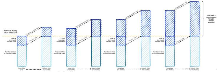 用户以折扣价买入锁定期为 3 个月 PT,剩余余额(折扣差额)进入杠杆可变收益头寸。每 3 个月,随着 PT 到期,这份折扣差额都将被结转至额外的杠杆可变收益头寸。