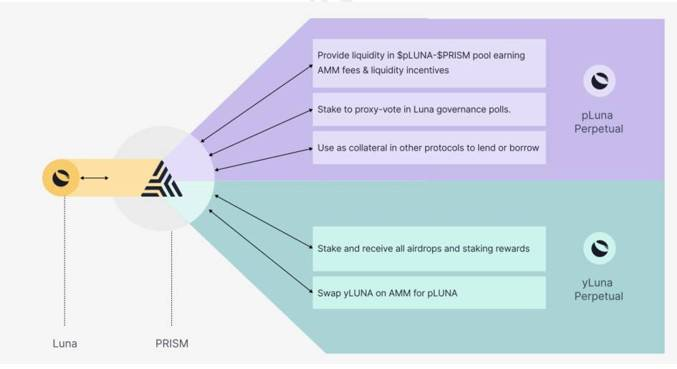 因为是基于 Terra 生态,所以在 PRISM v1.0 版本中团队将首先使用 LUNA 作为底层资产,将其拆分成 本金代币-pLUNA 和收益代币-yLUNA,LUNA 持有者可选择 3 个月、6 个月、9 个月或永久的未来收益期限(目前还未推出)。在不久之后,PRISM 也会进一步扩大其抵押品品种,这就会包括主流的 PoS 资产、Terra 生态的原生资产等。