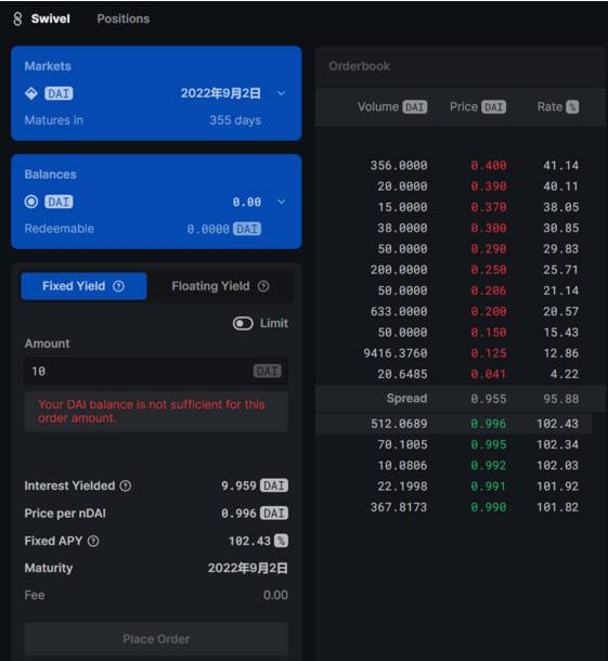 不管是从 UI 设计(Fixed Yield 与 Floating Yield)还是官方给的案例说明,都能看出来 Swivel 更突出了其产品风险分级的功效,而且 order book 这种模式在收益代币化协议里也确实是独树一帜,更适合专业的交易员。
