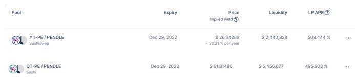 Pendle 在 8 月 18 日推出的一项关键资产是 PENDLE / ETH Sushiswap 池,简称为 Pe。