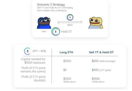 折扣价买 ETH (折价长仓):所谓 「折扣价」 的折扣其实就是时间成本,即用户可以通过出售 YT 并持有相应的 OT 直至到期,在标的资产上建立杠杆头寸 (没有清算风险):