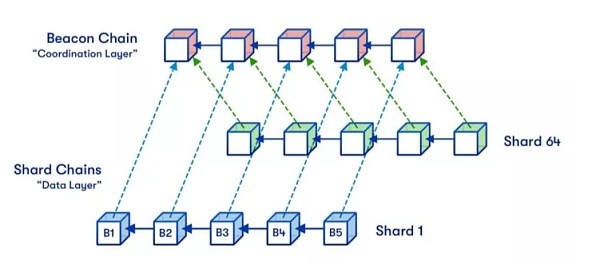 目前,ETH2.0计划有64个分片,通过Beacon Chain协调分片之间的交互。对于分片是否应该仅仅提供额外的数据,还是它们也应具备有代码执行功能,现今仍存在争议。