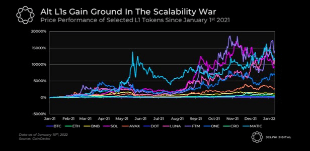 上表可看出一些跨链桥的 TVL 自 9 月以来急剧上升,目前约 90 亿美元,自 9 月 1 日到 2022年 1 月初,这组跨链桥的平均回报率为 108%,而 ETH 的回报率为 -1%,标志着在去年下半年替代 L1 的起飞,且表现相当强劲。