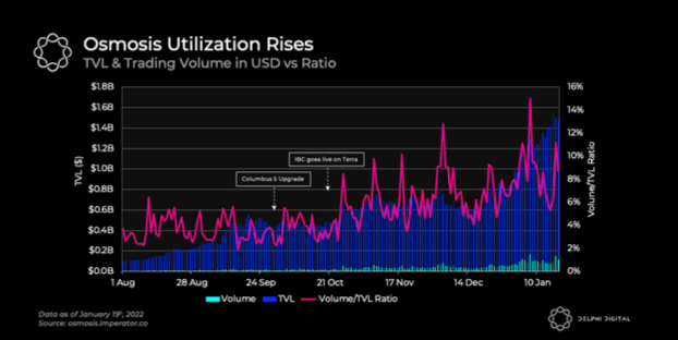 新的流动性引导:像 Osmosis 这样的 IBC 原生 DEX 的出现,将更容易促进 IBC 上社区主导和有机项目的流动性引导,而不依赖 CEX。ATOM 和 OSMO 等代币的用户、质押者、流动性提供者可能会在今年得到更多的空投。