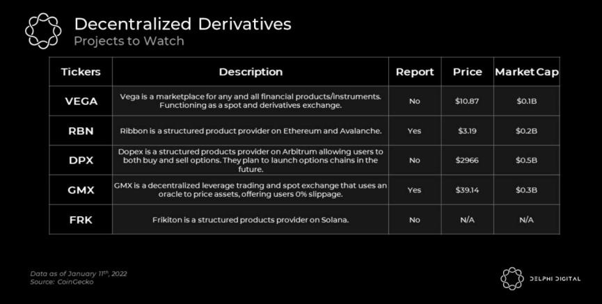 Vega:去中心化衍生品、现货交易市场。 GMX:使用预言机定价模型,兼作现货和杠杆交易所。此外,新兴的期权和结构化产品在各种 L1 和 L2 的发展中可行性增加,Ribbon 和 Opyn 2021 年 4 ?份就推出了去中?化期权产品。期权协议和永续合约平台的集成是另一个创新领域,可进行 delta 对冲并提高资本效率。 Delphi Digital 分析师列出两个期权项目: