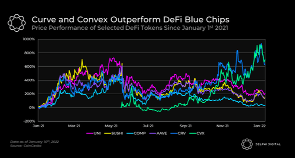 Delphi Digital 还预测去中心化稳定币的造币王者 Curve (CRV) 和 Convex 的共生关系将使其成为 TVL 的第一大应用,达到 230 亿美元(目前的 TVL 在发布时接近于 190 亿美元),在业绩方面超过其他 DeFi 蓝筹。