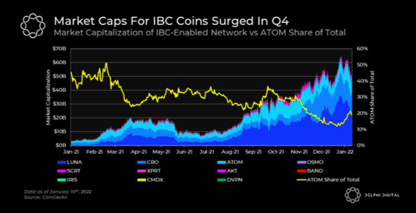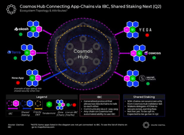 正如 Delphi Digital 在关于 Cosmos 的深入研究报告中提到的,在一个具有互操作性的 IBC 世界中,曾经孤立的区块链可以相互沟通。展望未来,Cosmos 第二季度的路线图显示将推出 Interchain 质押、Interchain 账户、流动性质押以及推出更好的桥来连接 Cosmos,这些发展将为其实现下一波增长。值得注意的是,Interchain 质押能实际推动 Cosmos 生态的孵化,因为它能让开发者更加容易启动应用程序。