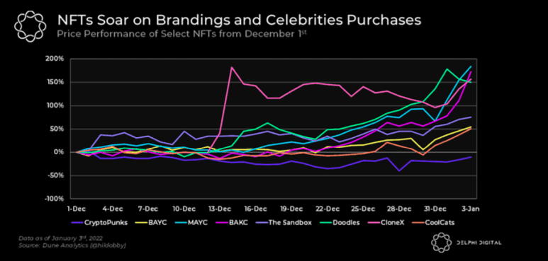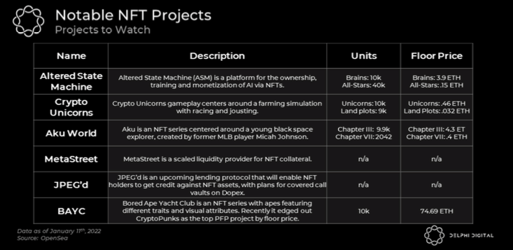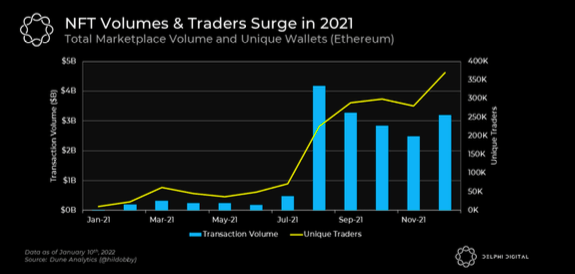 NFT 在 2021 年起飞,虽然 NFT 已经存在了很久,但 2021 年是它们进入主流话题的一年, 像 OpenSea 这样的市场平台也迎来了爆炸式增长。NFT 市场吸引了很多传统公司和名人入局。NFT 也在 2022 年迎来火热开局,2022 年 1 月是 NFT 交易量和数量表现最好的一个月,买家对新项目的兴奋度仍然非常高。