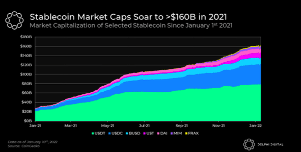 稳定币在 2021 年爆炸性增长,总市值超过 1500 亿美元。这种激增证明了稳定币作为加密货币 的「杀手级应用 」,产品和市场高度契合,像 USDC 和 USDT 这样的资产在整个加密货币生态系统中无处不在,这一趋势也将继续下去。