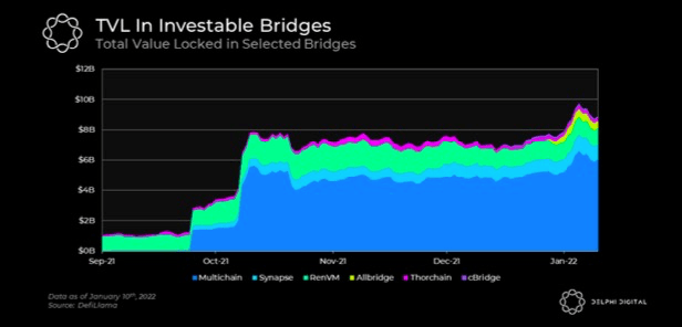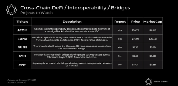 另一种发挥替代 L1 和扩容解决方案的方式是通过桥和跨链基础设施。最终,跨链基础设施的目标是以高效(并希望是)分散的方式在链上无缝转移资产。随着越来越多的 L1 和 L2 解决方案的不断涌现,现在挑选一种特定的资产,甚至是一组资产,最终赢得这场竞赛还为时过早。不过,可以肯定的是,这个领域的竞争只会升温,因为 2021 年爆发的多链叙事不会很快消失。