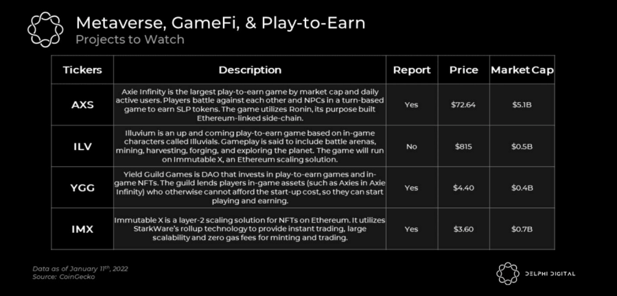去年,Axie Infinity 爆发并证明了游戏赚钱的概念,现在有一系列 P2E 游戏试图复制 Axie 的成功。随着生态系统的增加,从创新中过滤噪音将是一个越来越重要和困难的任务。大多数项目将最终被淘汰,不过,这只是游戏新时代的开始,像 Illuvium、Crypto Unicorns 和 Ember Sword 这样的项目将带来 AAA 级的图形和游戏性。此外,游戏链也在的竞争,目前突出的是Immutable X、Ronin Chain、Solana 和 Polygon。