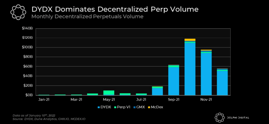 去中心化衍生品在 2021 年迅速升温,在其超越其中心化同行前仍有巨大的增长空间。dYdX 在 DeFi 衍生品领域处于主导地位,Delphi Digital 预计它仍将成为一个重要的参与者,但 2022 年去中心化衍生品的竞争可能会随着更多永续合约交易所在各种扩容解决方案中推出而升温。