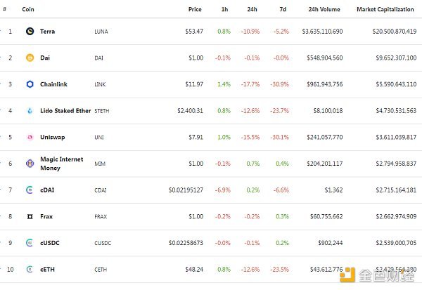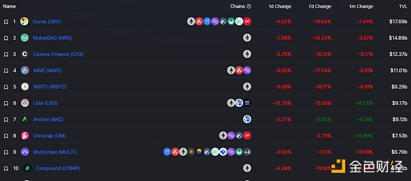 DeFi项目锁定资产前十排名及锁仓量 数据来源:defillama
