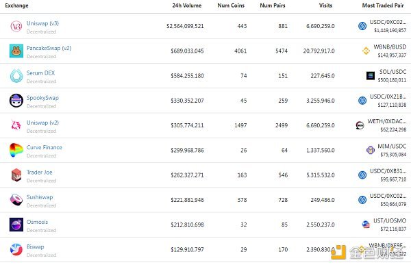 过去24小时去中心化交易所的交易量 数据来源:coingecko