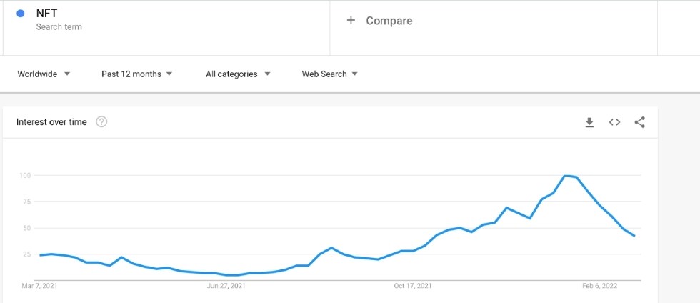 根据 Google 趋势 (GT)数据,对 NFT 的兴趣已经猛增,因为“NFT”一词的搜索查询从 2022 年第一个月在 GT 上的 100 分下降到本周的 42 分。