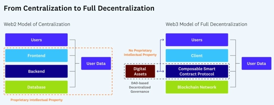 对于使用此模型的 web3 系统,区块链网络和智能合约协议的去中心化主要是由于这些层的技术去中心化,以及通过以 DAO 的形式启动去中心化治理来控制智能-来自创建系统的开发公司的合同协议。将智能合约协议部署到公共区块链并启动其 DAO 会为系统带来透明度以及更高的安全性和保障性,这意味着没有个人或团体控制系统。