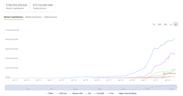据CoinGecko最新数据,目前加密行业总市值为2.03万亿美元,较年初的2.34万亿美元有所回落,而稳定币市值则已突破1900亿美元,2022年以来增长超220亿美元。一面是市场持续震荡,一面是稳定币势如破竹,其在加密行业的地位空前提升。