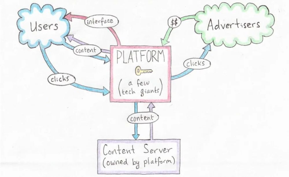 图 1 描绘了构成当前以平台为中心范式的四个组件。共有三个利益相关者:平台(红色)、广告商(绿色)和用户(蓝色)。一切都经过平台。该平台拥有并中心化控制内容服务器,存储用户通过其界面生成的内容,并从该内容中提取部分内容予以显示。至关重要的是,该平台是用户和广告商之间的纽带。广告商向平台付费以向用户显示广告,从而为广告商产生点击。在这种架构下,平台掌控所有钥匙。它控制着系统生成的所有价值。