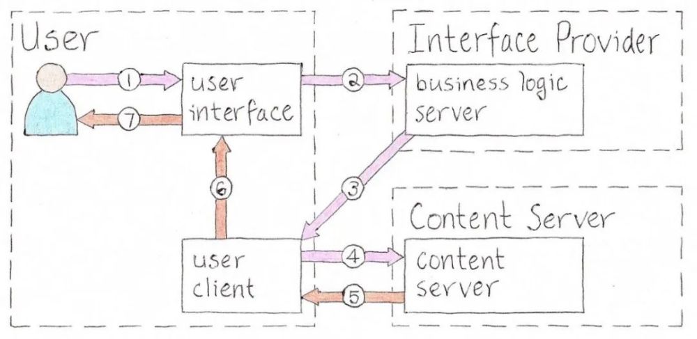 图3简单演示了如何通过当前的中心化平台将内容交付给用户。用户通过用户界面发出请求,用户界面将请求传递到业务逻辑服务器(步骤1和2)。该服务器确定需要什么内容,然后从内容服务器获取它(步骤3和4)。然后准备好要显示的内容,并发送到用户界面,用户界面将其显示给用户(步骤5和6)。业务逻辑和内容服务器由平台控制,并在平台的计算机上运行,而用户界面(例如浏览器或应用程序)在用户的计算机上运行。