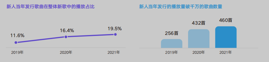 新生力量的涌入极大的活跃了华语数字音乐市场,新人体量稳步上升的同时,新人当年发布的新歌播放占比也在稳步上升,这一数据显示了新人进入市场不仅仅成为了填充市场数据的炮灰,这一群体的关注度不断提高,市场认可度也有所增高,在2021年,有460首新人当年发行歌曲的播放量突破千万大关。