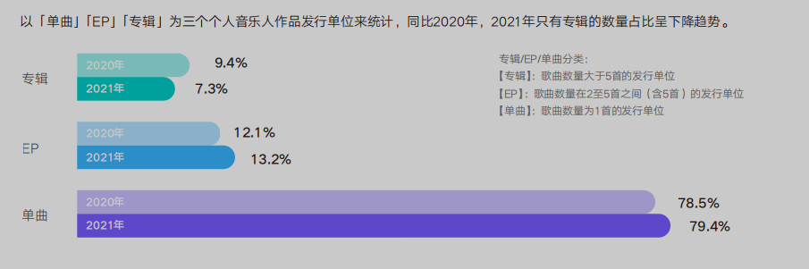 从《白皮书》现实的数据来看,发布新曲的三种主要方式——专辑、EP、单曲——中,单曲占据了绝对的优势,而专辑也是这三种方式中唯一一个占比下降的形式。单曲发布确实更为简便快捷,也无需考虑正张专辑 音乐是否有统一的主体性或者连贯性,但另一方面,音乐也碎片化消费仍然令部分听众难以适应。不过,部分头部艺人还是在坚持以专辑的形式发布音乐,相较于其他网络音乐人,这些更为靠近专业行业领域的音乐人对于专辑的坚持似也反映着“专辑”这一形式在业内仍然具有比较高的认可度,同时也是衡量一位音乐人才华和创作水准的指标之一。