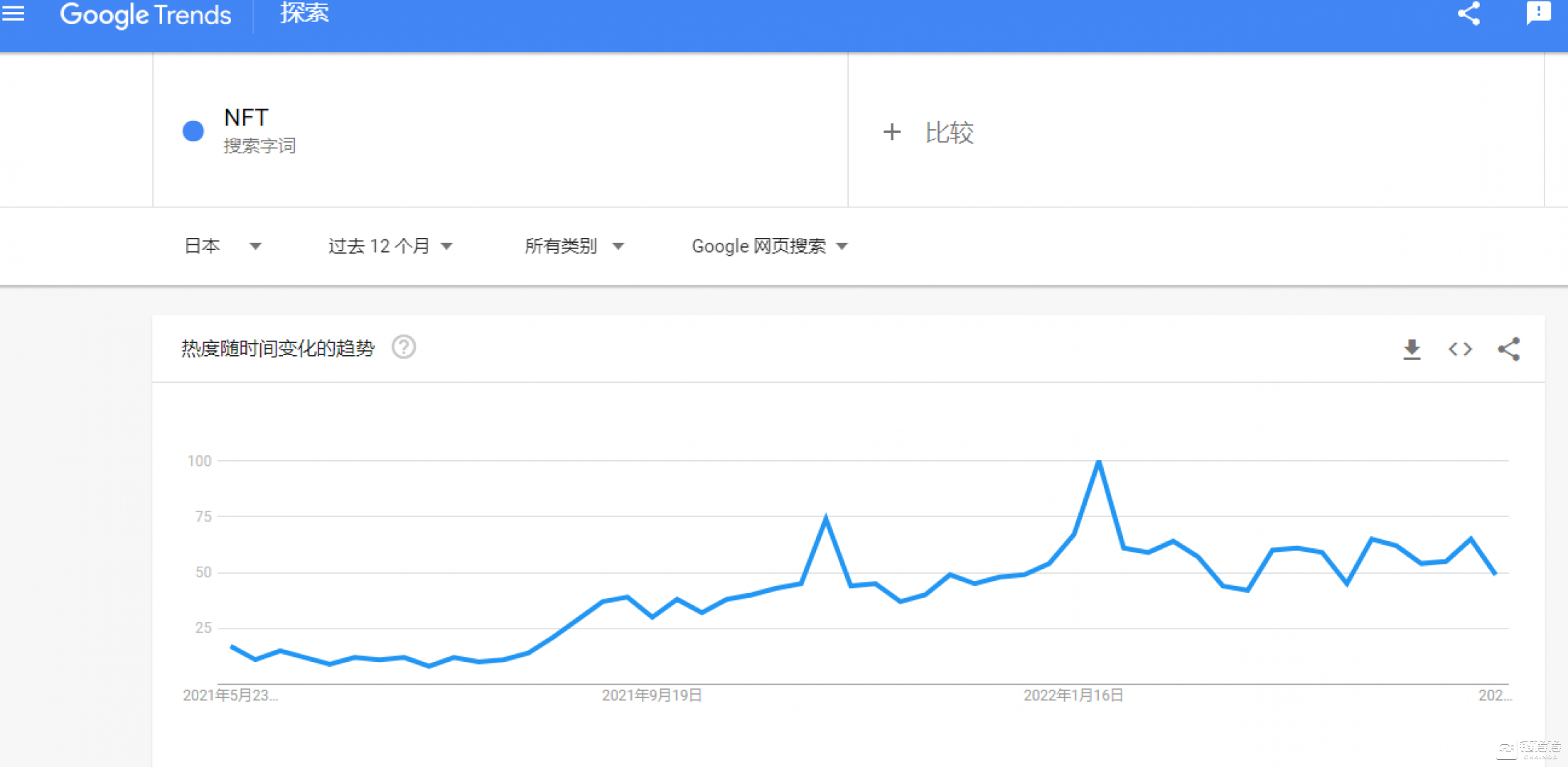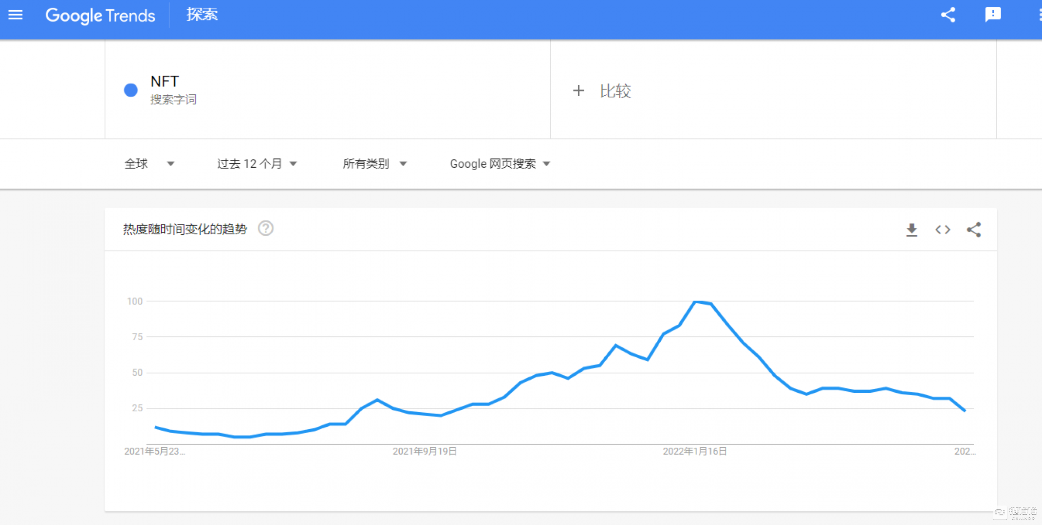 在谷歌趋势中,链得得看到在整个 2021 年 NFT 检索的频次时间线。其中,在次峰过去的 2022 年 1 月底之后,已经开始出现下滑曲线,与 Nonfungilbe 的数据看起来比较契合。