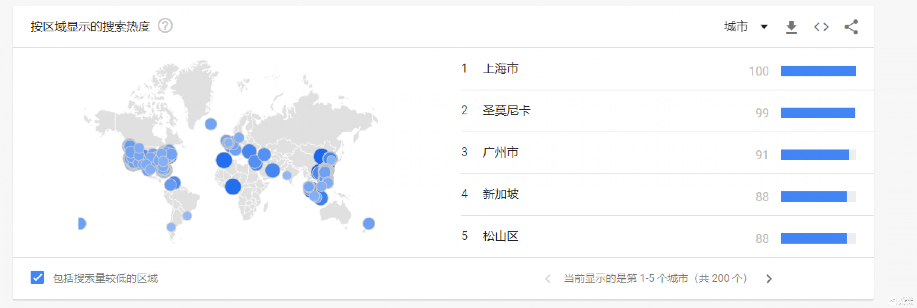 不过链得得发现,让人意外的是,在过去 12 个月内,按照城市排名来看,排名前五的城市中国占了三个,NFT 检索频次最高的是上海地区,其次是美国加州的圣莫妮卡,第三是广州,第四是新加坡,第五是中国台湾松山区。