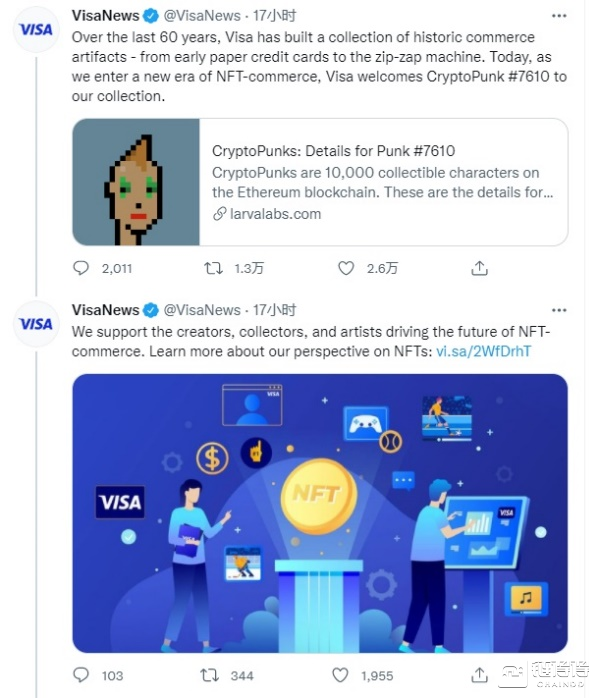 另一个值得关注的节点是 Visa 的入局。Visa 在 2021 年 8 月 24 日表示,公司花费超 15 万美元从CryptoPunks 家族手中购买了一个名为 CryptoPunk#7610 的 NFT。