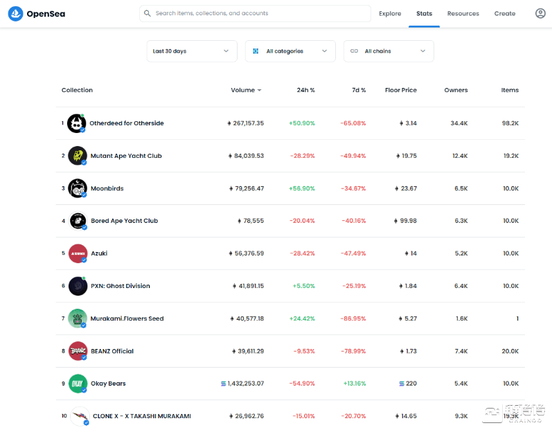 链得得在截止发稿时间的 5 月 18 日登录 Opensea 发现,目前该平台收藏排名前 10 的几个 NFT,在一周内只有 1 个有上升趋势,余下均呈断崖式下跌。排名第一的 Otherdeed for otherside,过去一周受挫率达到65% 以上。