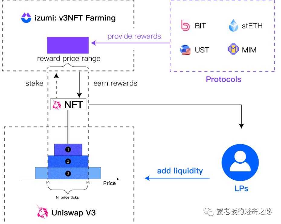 Izumi Finance 在 Uniswap V3 的方案基础上,将流动性挖矿过程中的 LP 细分出项目方、专业做市商等角色,并针对这些角色在维持项目通证价格、提升流动性提供收益、减少无常损失等方面的需求,做出了一系列优化。