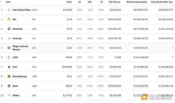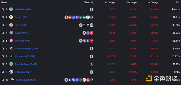 DeFi项目锁定资产前十排名及锁仓量 数据来源:defillama