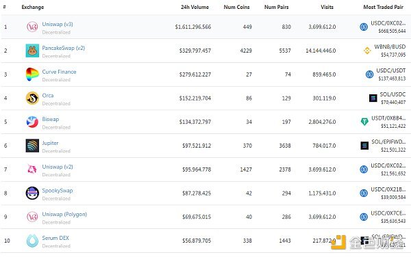 过去24小时去中心化交易所的交易量 数据来源:coingecko