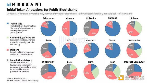 与 Ethereum 对比,Solana 内部人员持有的代币数量比例很高。据Messari 的数据,Solana 大约 48% 的代币由内部人士拥有,包括 Solana Labs 团队成员和风险投资机构。此外,另外三分之一的供应已分配给生态系统开发,在 Solana 的公开发售中只分配了相对较少的代币。而 Ethereum 通过公开发售分发了大约 80% 的代币,内部人士只持有总供应量的 15%。